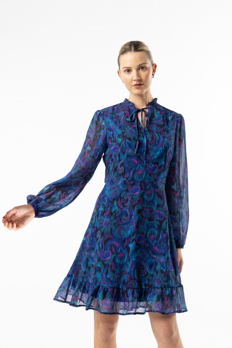 שמלת שיפון עם צווארון קשירה בהדפס פייזלי כחול