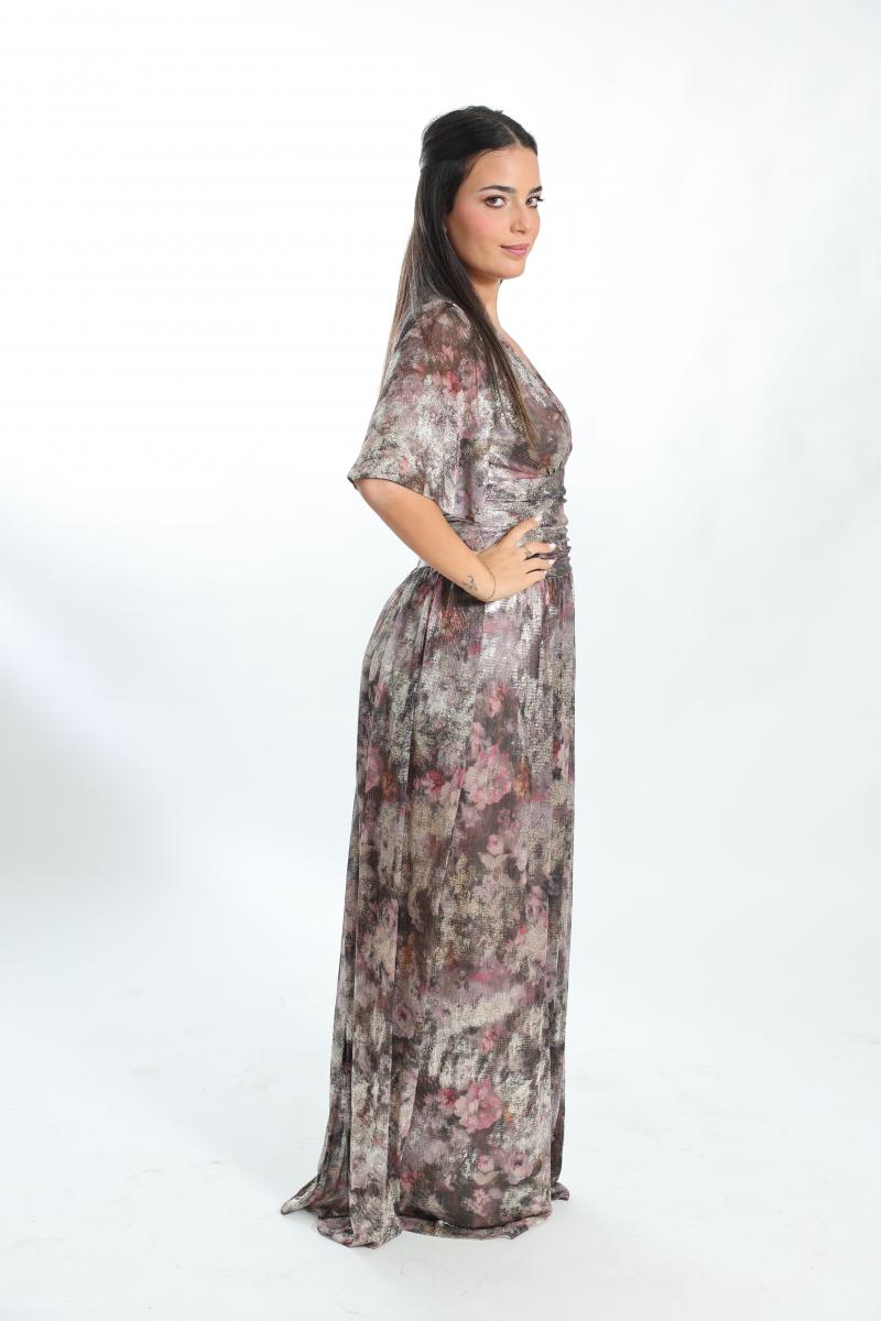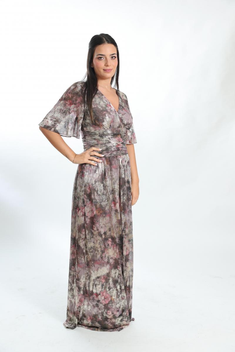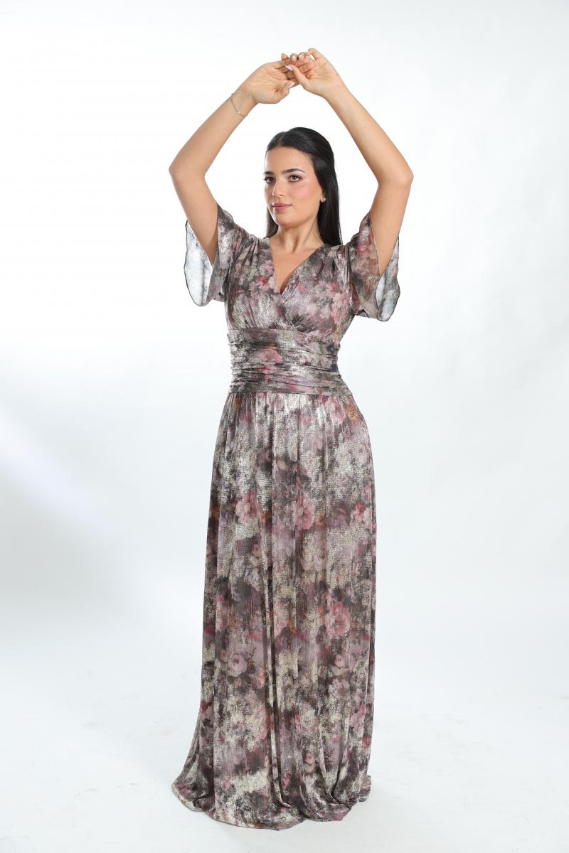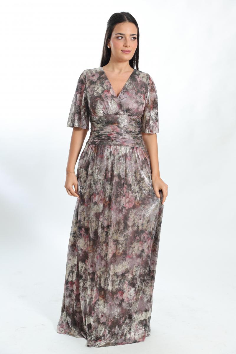 שמלת מקסי שימר מודפס מעטפת עם מותן מודגש ושרוולי פרפר